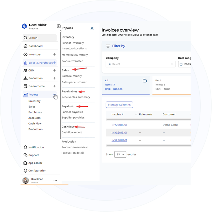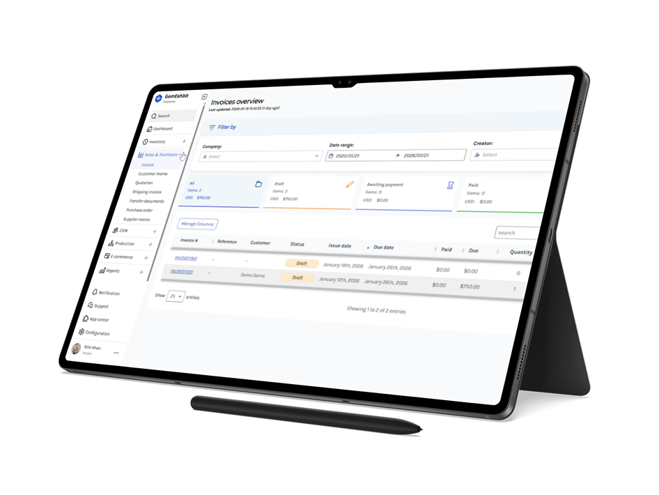 GemExhibit Enterprise Accounting is designed specifically for gemstone manufacturers, traders, and enterprise teams. It simplifies financial management while giving you complete control and visibility over your business finances. From invoicing to reporting, every accounting feature is aligned with real gemstone workflows.