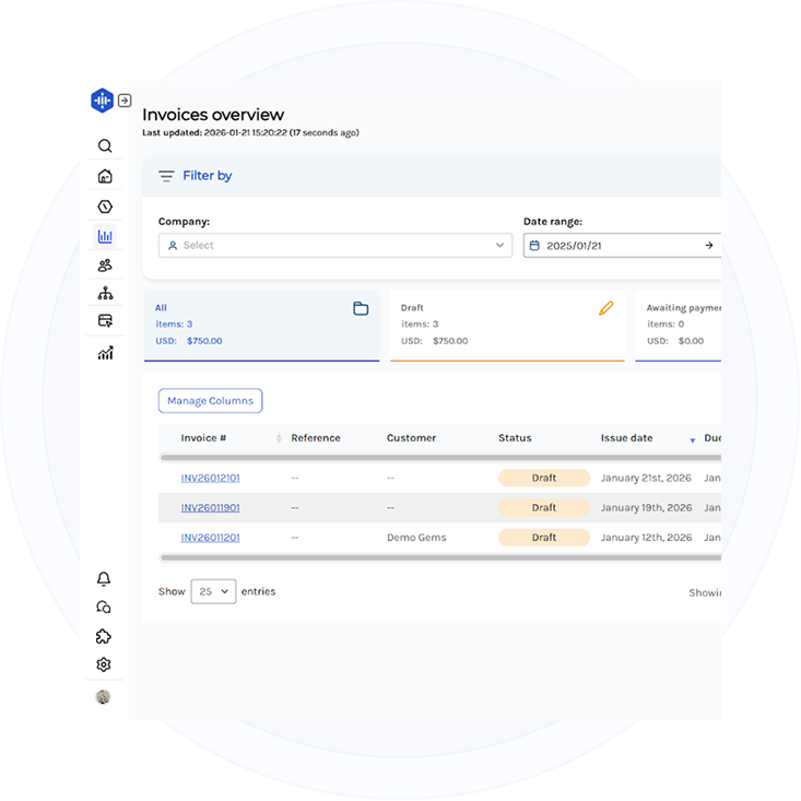 Monitor incoming and outgoing payments with ease. Know which invoices are paid, pending, or overdue at a glance. GemExhibit Enterprise helps you maintain healthy cash flow and follow up confidently with customers.