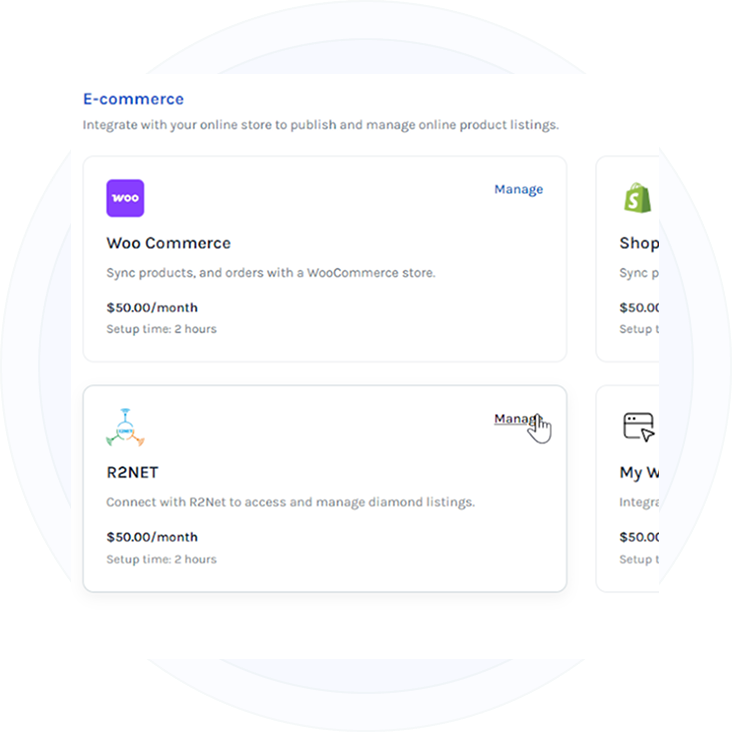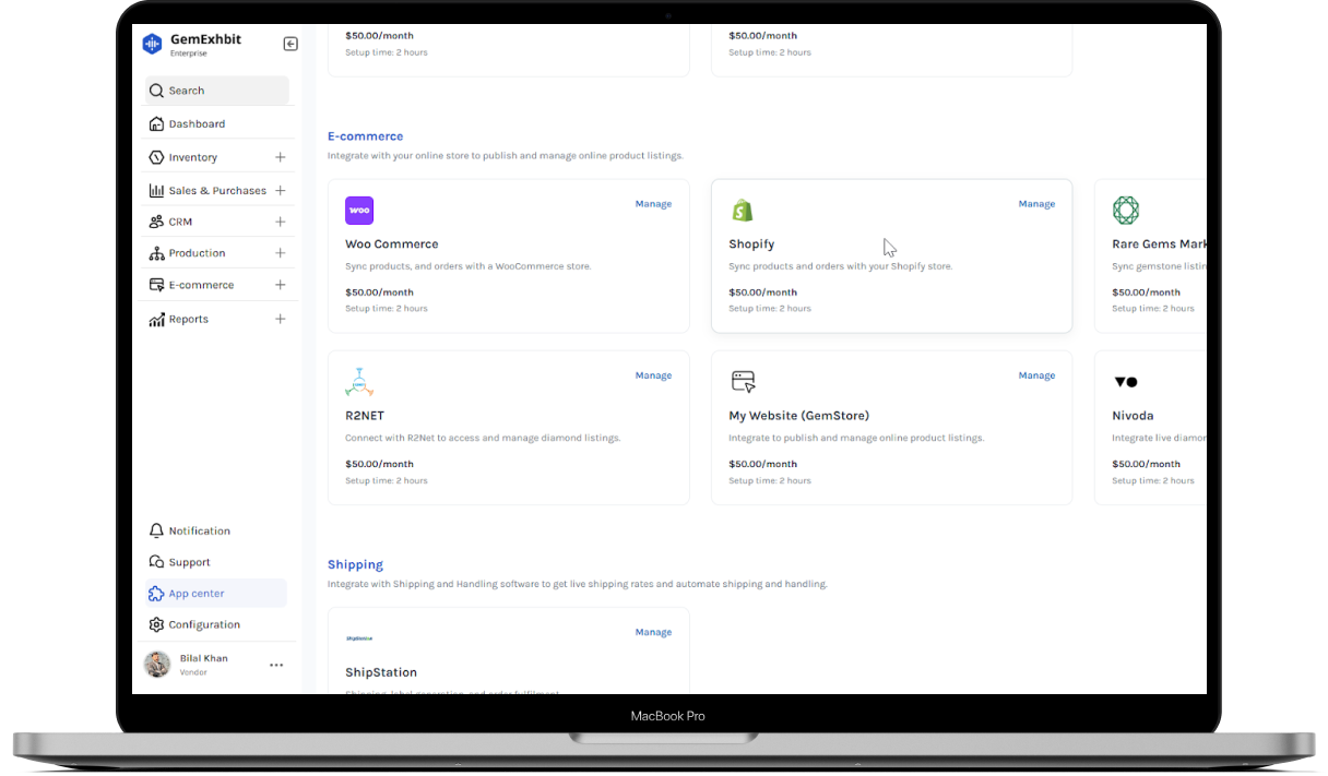 Expand beyond marketplaces by integrating with ecommerce platforms such as Shopify and WooCommerce. Publish selected inventory to your online store and manage products, pricing, and availability directly from GemExhibit Enterprise without duplicate work.
